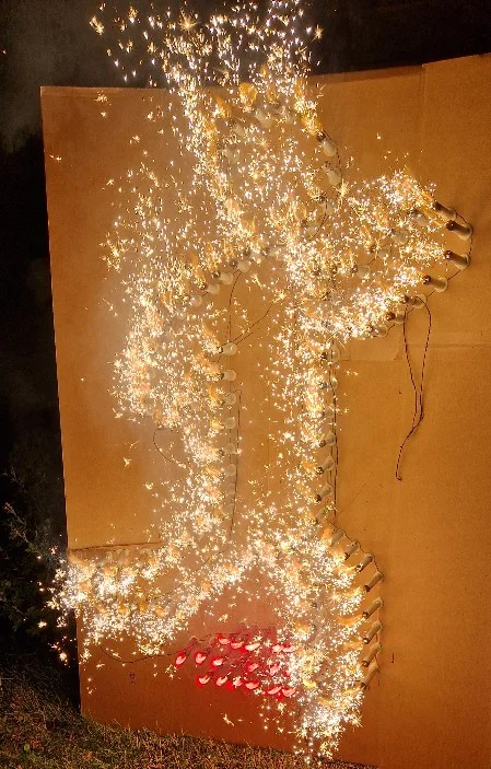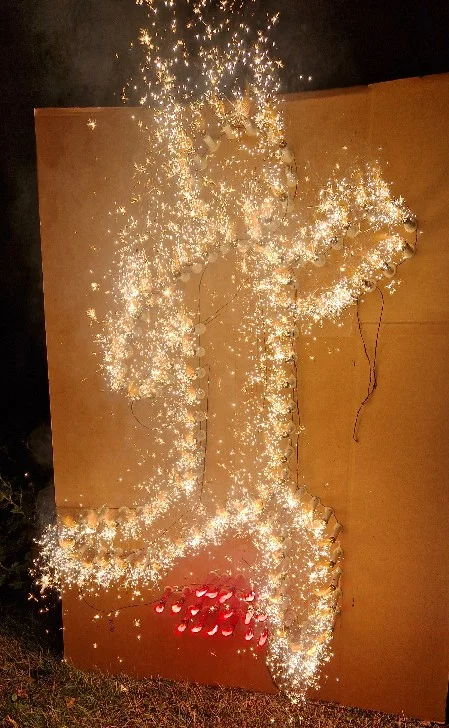 Die Phase der Kreation und des Baus führte zu den fertigen Feuerskulpturen "Der Läufer" und "Die Frau in hoffnungsvoller Erwartung". Mithilfe der 3D-Computermodelle konnte ich verschiedene Gestaltungsmöglichkeiten erkunden und die endgültige Form der Skulpturen verfeinern. Die Verwendung von Pappe als temporäres Material ermöglichte es, die Struktur und Ästhetik zu testen, bevor der Übergang zu robusteren Materialien erfolgte. Das Ergebnis waren eindrucksvolle Feuerskulpturen, die Emotionen weckten und die Botschaft der Vergänglichkeit der Kunst effektvoll vermittelten.
